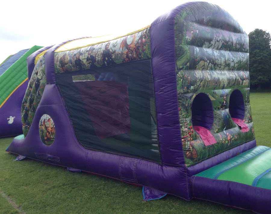 Suitable for adults our children our fantasy fun run is ideal for gardens and events. If you like Harry Potter or fantasy theme then this is the fun run for you. In one end, through the biff and bash posts, up the foam steps, then down the slide to finish.