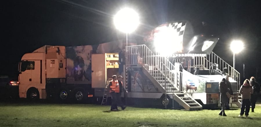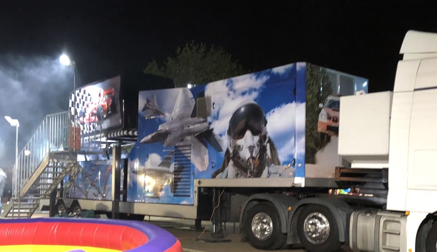This is a large ride and is on an articulated lorry so large lorry access is required, it is best suited to hard standing, it can be used on grass areas but the ground must be solid as this ride weighs 14 ton.